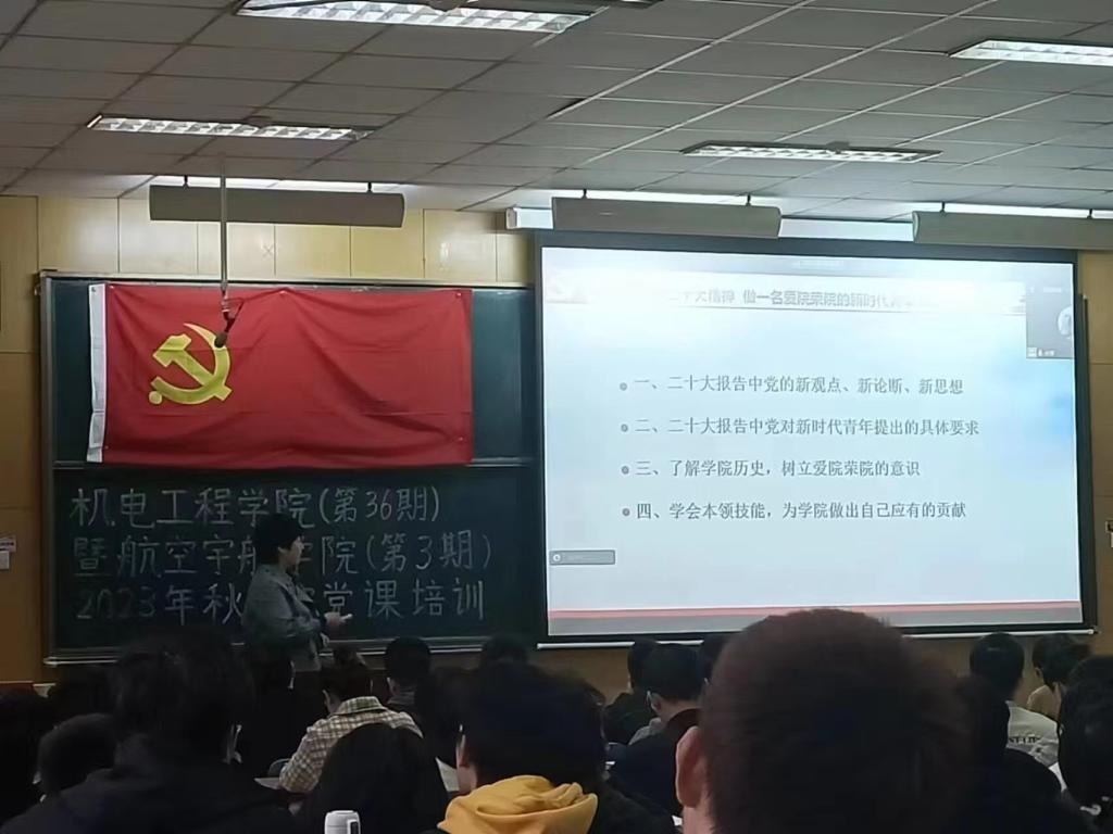 为不断加强入党积极分子的教育培养,进一步提升党员发展质量,2023年11月4日、11月5日,航空宇航学院暨机电工程学院在于11208H教室举办了2023年秋季学期入党积极分子培训班,以提高入党积极分子对党的基本理论、基本路线、基本方略的认识,增强党性修养。