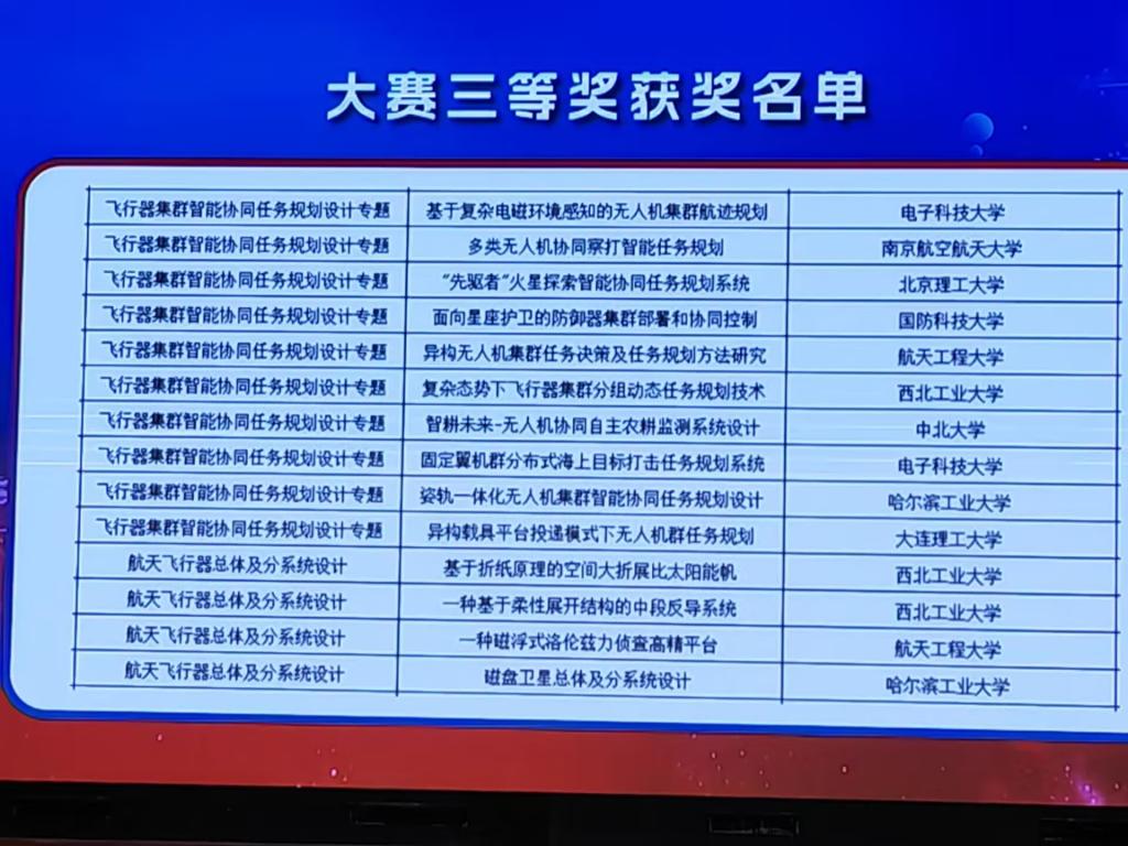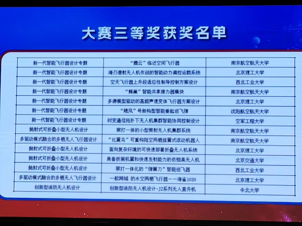 由李京阳老师指导,高舒煜、海日汗、韩雨桐、徐震翰、赵荣珍等研究生完成的“创新型消防无人机设计-JZ系列无人直升机”项目团队、由邵星灵老师指导,朱璟、刘洪城、张飞智等研究生完成的“智耕未来-无人机协同自主农耕监测系统设计”项目团队,在大赛中表现优异,均荣获大赛三等奖,蔚蓝档案