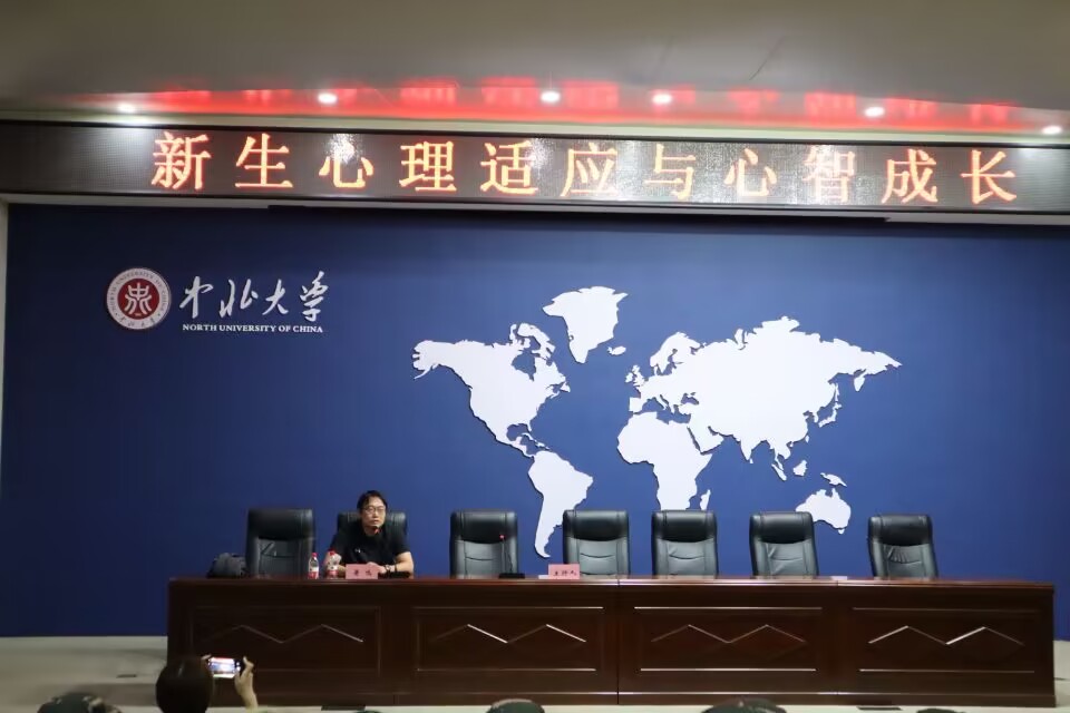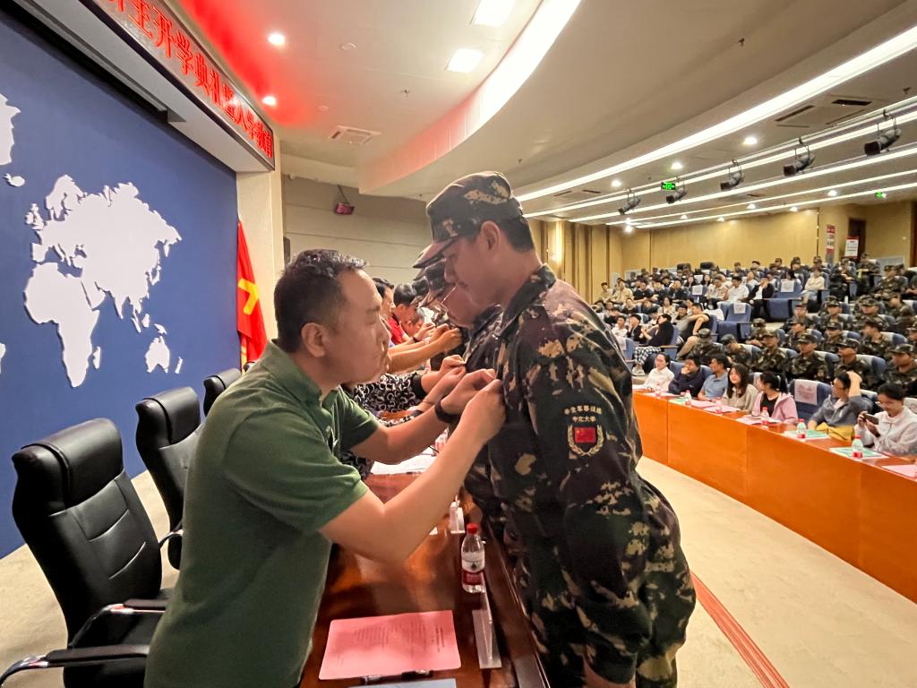 校徽佩戴仪式中,主席台就座人员为新生代表们佩戴校徽,校徽承载着中北人的光荣与使命,“蔚蓝档案