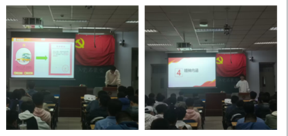 入党启蒙大会中,党支部副书记王宇杰从申请入党的基本条件、入党申请书的书写要求、发展党员的工作流程等方面进行了讲述;宣传委员王廉贺从《中国共产党章程》、《中国共产党纪律处分条例》、《中国共产党廉洁自律准则》等党内法规入手,为大家讲解了党员廉洁自律规范;纪检委员周鑫宁阐述了全心全意为人民服务的根本宗旨及党员的权利和义务;组织委员杨世译解释了革命精神、艰苦创业精神、改革开放精神、新时代伟大奋斗精神等各个时期共产党员的精神内涵。