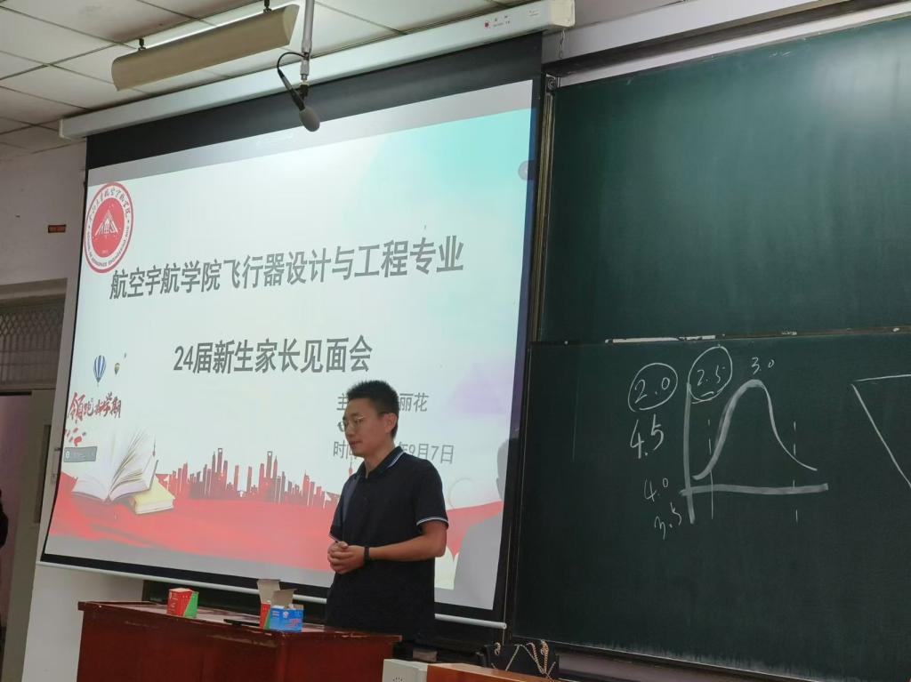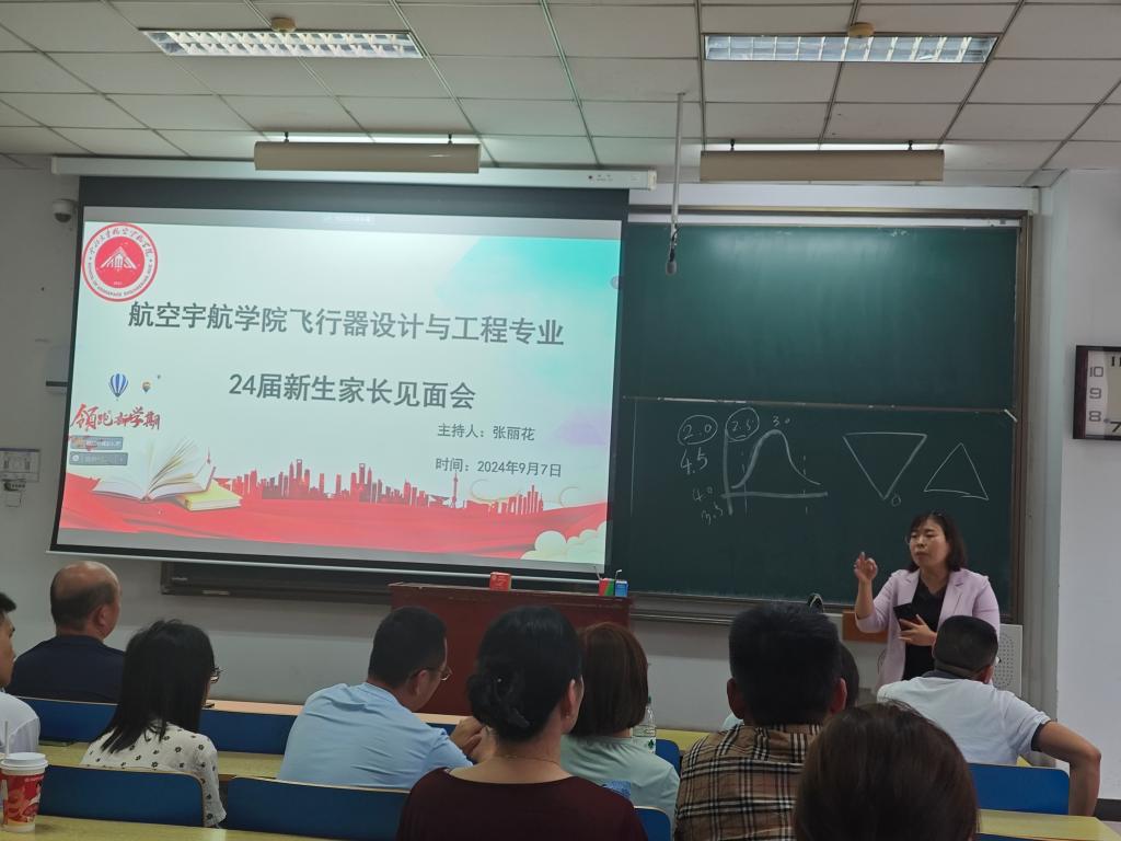 在11212H教室组织举办了2024级飞行器设计与工程专业新生家长见面会。本次见面会旨在加强家校沟通,共同关注学生成长,助力新生顺利度过大学时光。李京阳院长、各班班主任、朋辈导师及2024级新生家长共聚一堂,会议由张丽花老师进行主持,采用线上线下两种方式并进,共邀家长,共话学生的未来发展。