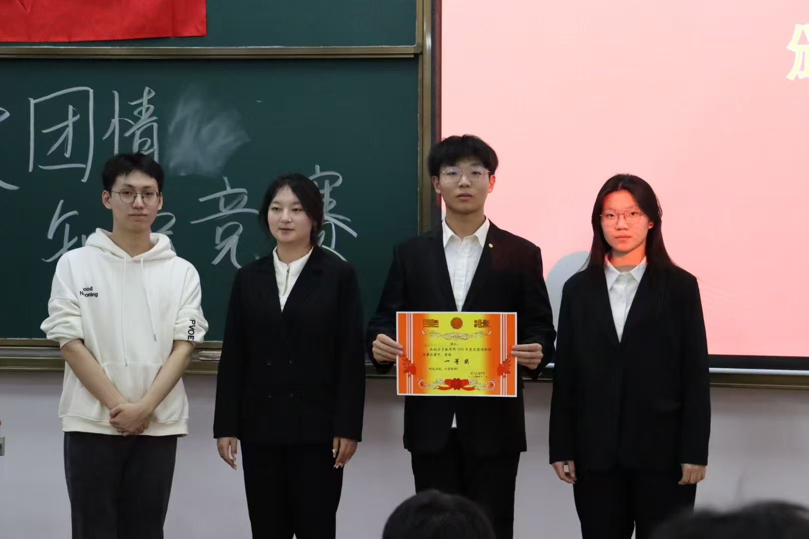 决赛于11月27日19:00在17405教室举行,采用了线下比赛的形式。决赛分为三轮进行,第一轮为必答题环节,八支队伍按顺序依次作答,每队三道题,答对得分,答错或不答扣分。 第二轮为抢答题环节,共十五道题,八支队伍共同抢答,答对得分,答错扣分。第三轮为展示环节,各队根据主题自由发挥表达,形式不限,时间三分钟,由评委打分。整个比赛过程紧张激烈,选手们表现出色,赢得了观众们的阵阵掌声。经过三轮激烈的角逐,最终决出了一等奖1名、二等奖2名、三等奖3名以及优秀奖2名。