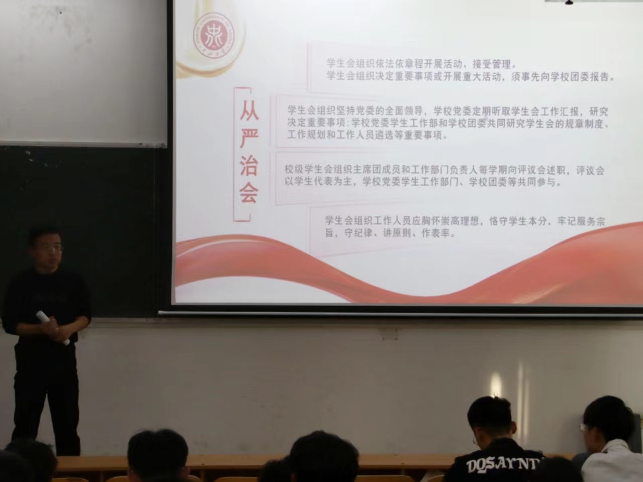 在十号教学楼举行青马工程暨学生骨干培训会。共60余名学生骨干参会,团委学生副书记曹璟琦主讲。培训会由团委副书记王姣主持。